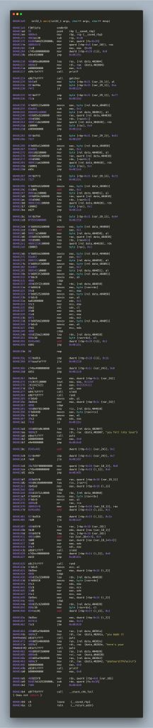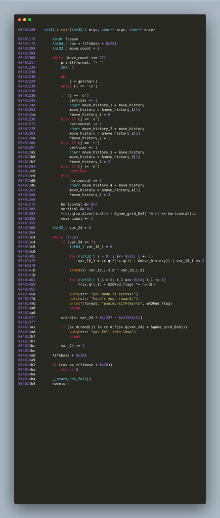 Before attempting anything, let’s start reading the IL we got from Binary Ninja and see what jumps out first. So, there is a counter that starts from 0 and ends in 27 and then it parses a character for being one of “w” “a” “s” “d”. WASD is a very popular control scheme for PC games – especially first person shooters, W moves the player forward, S backtracks, A and D controlling horizontal movement. So, when we enter “w”, the move (adjusting the vertical value by 1 – in this case decreasing) gets recorded into a buffer – given that we have 4 values that means a 2-bit value per buffer cell – 28×2 makes the buffer a 56-bit value essentially. Something that should be noted is that there is nothing stopping the player from entering an invalid character (or sequence thereof) – they are getting ignored and not passed onwards to the 56-bit buffer. Once the buffer is built then the program moves to its interesting verification logic.