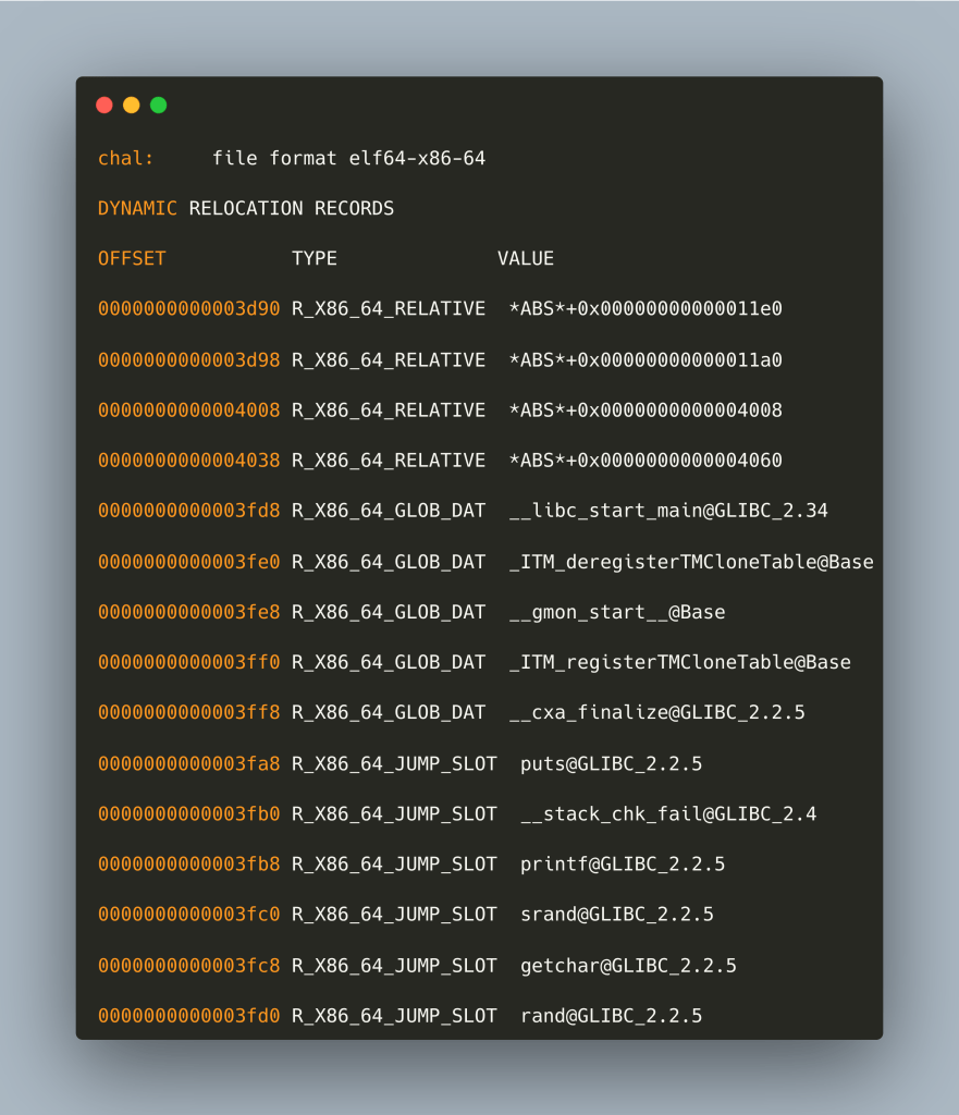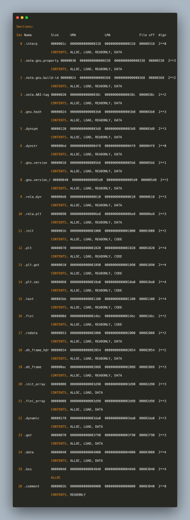 (for a more compact version you can use objdump -h chal |awk ‘{print $2}’ |egrep ‘^\.’)