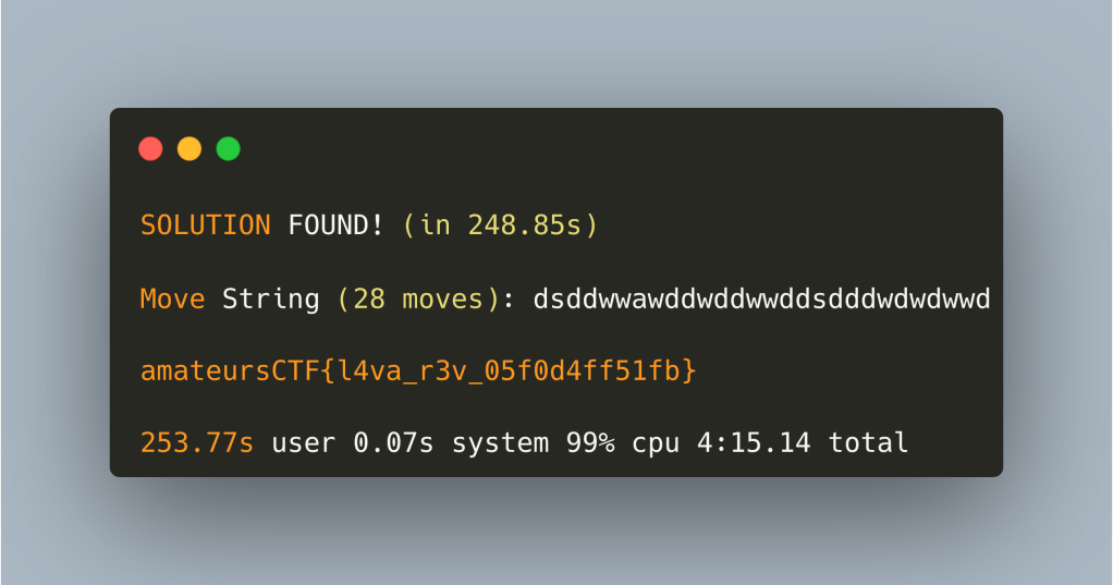 We get a solution, but two orders of magnitude slower than SAT. This is the engineering trade-off: solving the general case introduces complexity and overhead. For a time-critical CTF, DFS pruning would have sufficed.